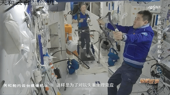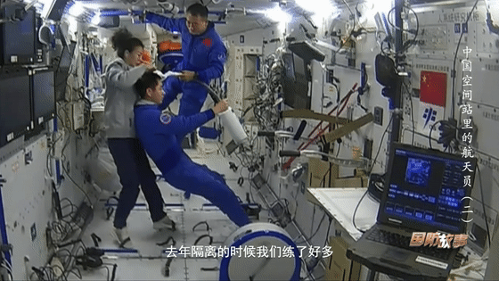 航天员们积极进行太空锻炼