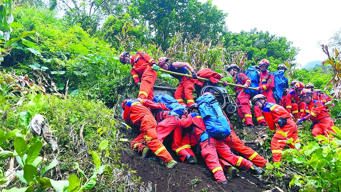 四川泸定地震发生后,雅安市消防人员转移受灾群众,抬着70多岁的瘫痪老人行进在山路上。 (图片来源:人民视觉)