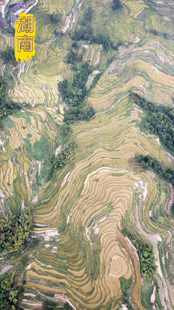 2022年9月22日拍摄的湖南省娄底市新化县紫鹊界梯田。金秋时节,紫鹊界梯田的水稻进入成熟收割期(无人机照片)。新华社记者陈振海摄
