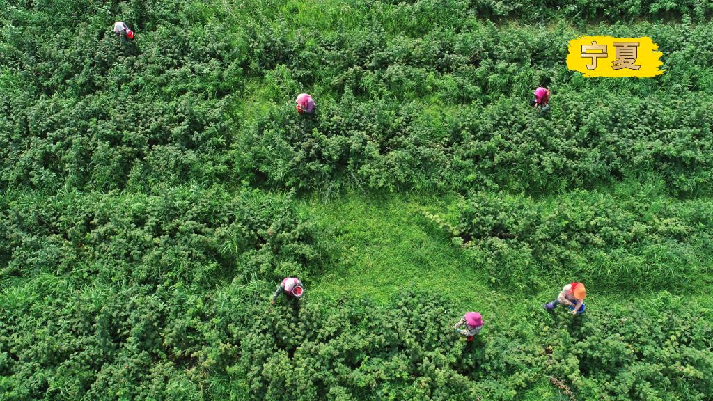 2022年8月2日,宁夏石嘴山市平罗县崇岗镇常青村红树莓种植基地,农户在采摘红树莓(无人机照片)。新华社记者王鹏摄