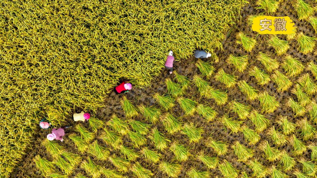 2022年9月13日,在安徽合肥庐江县白湖镇省级现代农业示范基地,农民在田间收割水稻(无人机照片)。新华社发(左学长 摄)