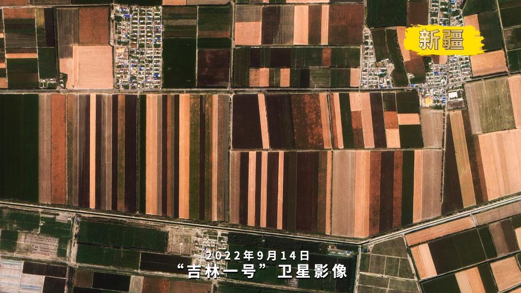 2022年9月14日,新疆维吾尔自治区巴音郭楞蒙古自治州和硕县丰收图景(“吉林一号”卫星拍摄)。