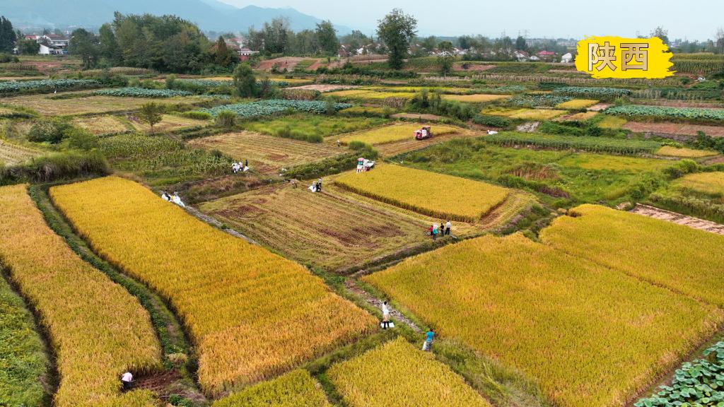 2022年9月4日,陕西省汉中市汉台区武乡镇的农民在田间收割水稻(无人机照片)。新华社记者陶明摄