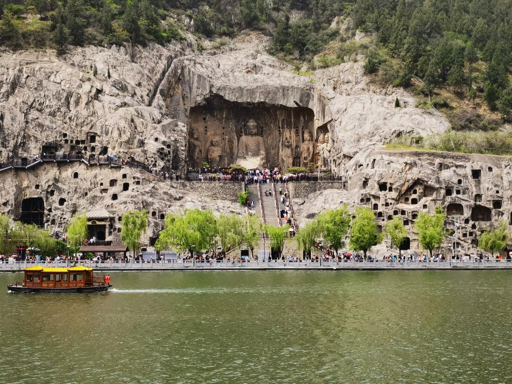 河南省洛阳市龙门石窟景区和黄河支流伊水(2021年4月15日摄)。新华社记者 吴炜玲摄