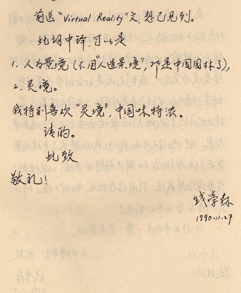 1990年11月27日,钱学森在信中将VR翻译为“灵境”。钱学森图书馆供图
