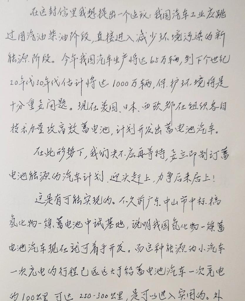 信中说,“在此形势下,我们绝不应再等待,要立即制订蓄电池能源的汽车计划,迎头赶上,力争后来居上。”