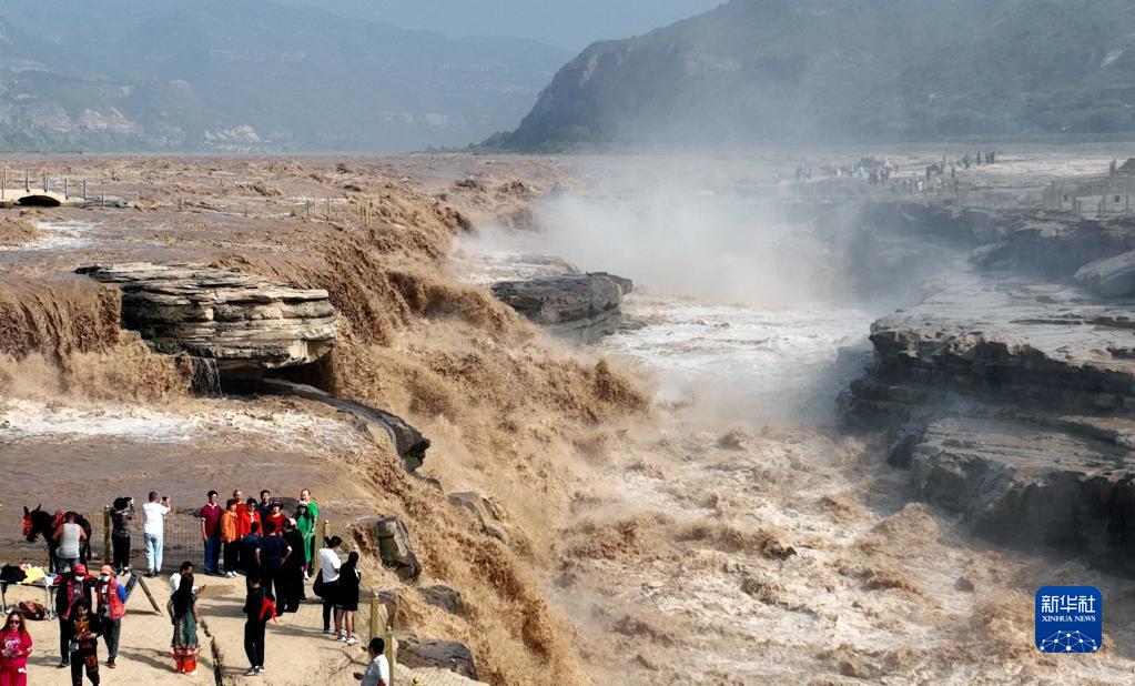 游人在黄河壶口瀑布游览(2022年9月15日摄,无人机照片)。新华社记者 陶明 摄