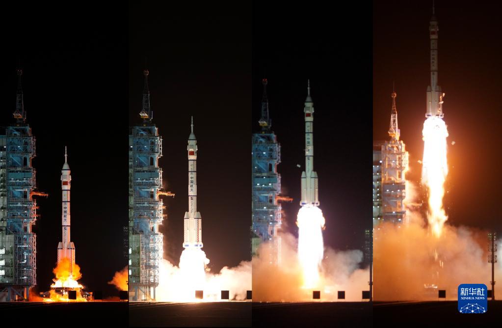 11月29日23时08分,搭载神舟十五号载人飞船的长征二号F遥十五运载火箭在酒泉卫星发射中心点火发射,约10分钟后,神舟十五号载人飞船与火箭成功分离,进入预定轨道,航天员乘组状态良好,发射取得圆满成功(拼版照片)。新华社记者 李刚 摄