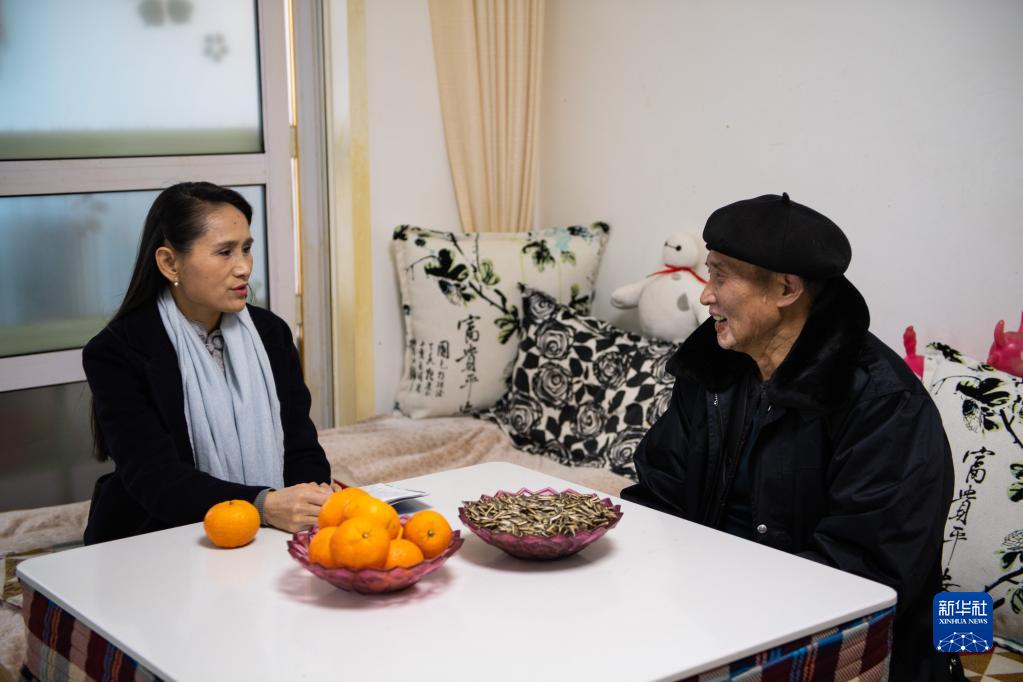 2月16日,在常德市武陵区华西小区,杜美霜(左)与花鼓戏退休艺人王德华交流,并征求戏曲发展的相关意见。