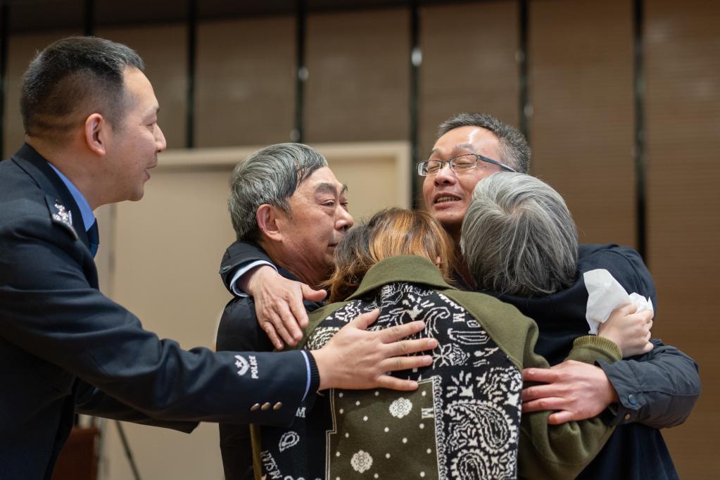 2022年12月30日,在四川省绵阳市公安局举行的认亲仪式上,失踪37年的男子马某某(右二)与亲生父母相拥。(绵阳市公安局供图)