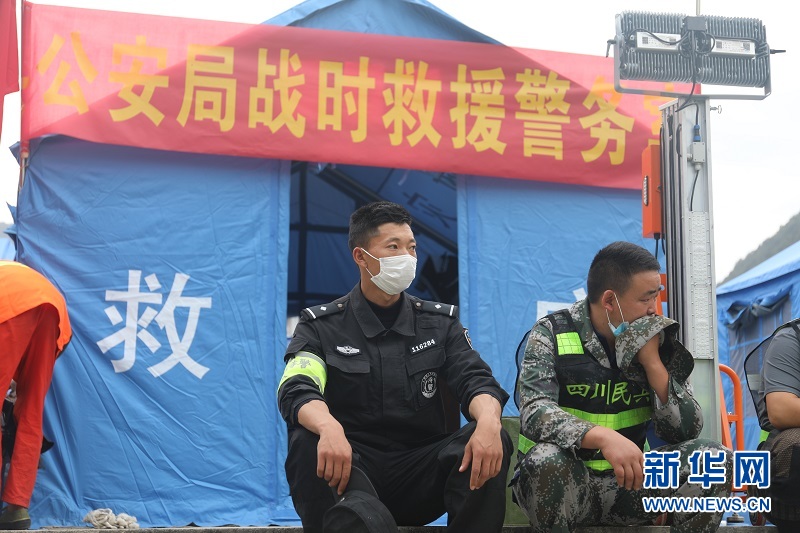 四川甘孜州公安局特警支队特警秦晓强和战友在救援现场。