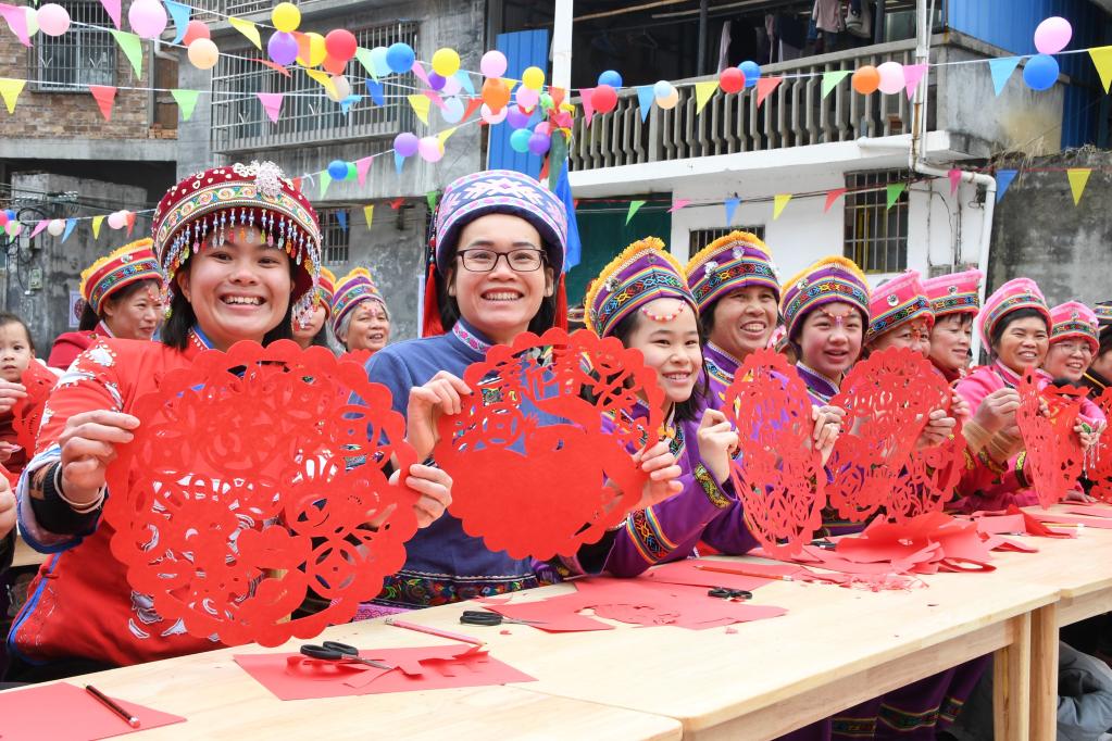 在广西罗城仫佬族自治县四把镇小稔屯,当地仫佬族村民举行“百兔迎春”非遗剪纸活动。