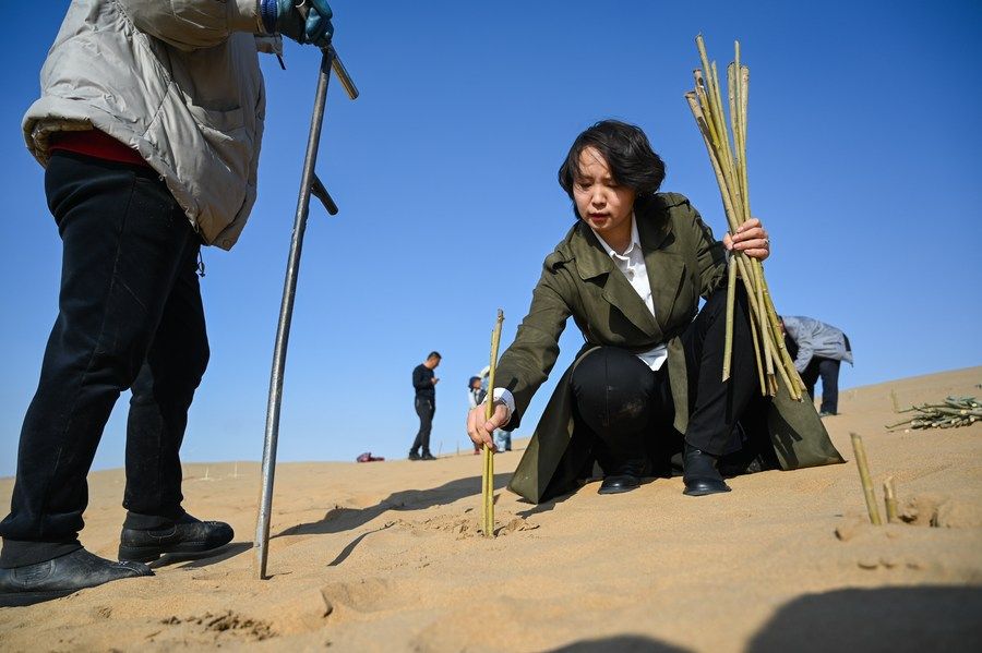 ↑2022年4月18日,在银肯塔拉生态旅游区沙漠中,李芳和员工们一起栽种树苗。新华社记者刘磊摄