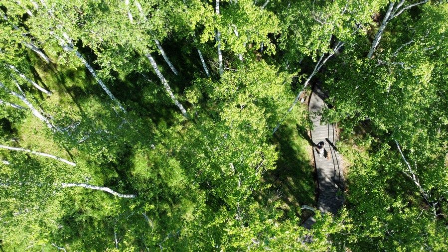 ↑2022年6月27日,游客在额尔古纳市白桦林景区游玩。新华社记者贝赫摄