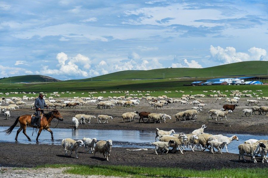 ↑2022年6月26日,牧民在内蒙古呼伦贝尔市新巴尔虎左旗道乐都夏营地放牧。