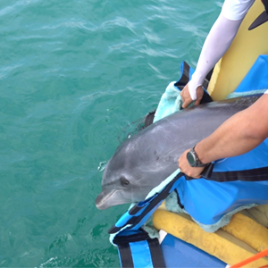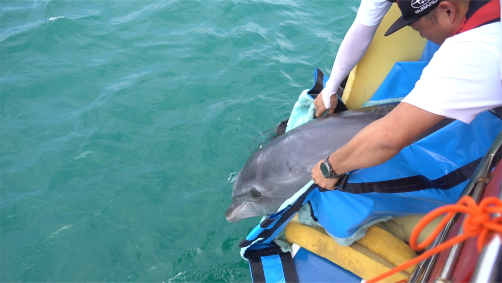 “它已经在这很久了,有时张嘴巴,有时发出声音,时不时张开一下呼吸孔。”这位游客第一时间与蓝丝带海洋保护协会取得了联系,拍视频实时向蒲冰梅反馈海豚状况。当天下午,在多方共同努力下,海豚被转送至儋州一海洋生物科研基地救治。