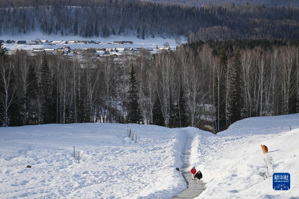 3月30日清晨,游客前往禾木村后山的观景平台。