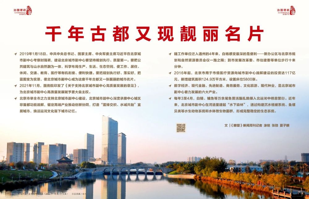 北京城市副中心的发展,不仅事关一地的时与势,更饱含人民的期待、协同的使命、国家的厚望、历史的重任。北京城市副中心党工委常务副书记、管委会常务副主任、通州区委书记孟景伟表示,2023年,北京城市副中心将紧抓高质量这条主线,在生态、民生保障、文旅、运河商务区、重点工程项目等方面蓄力再发,推动发展迈上新台阶。