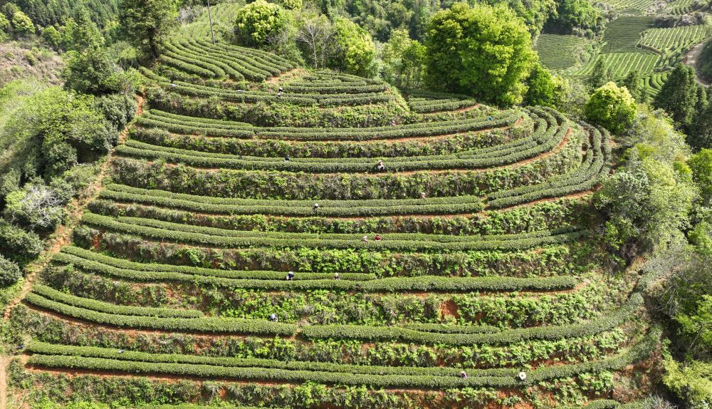 在福建省武夷山市,采茶女工在茶山采茶(无人机照片,2023年4月7日摄)。新华社发(邱汝泉 摄)