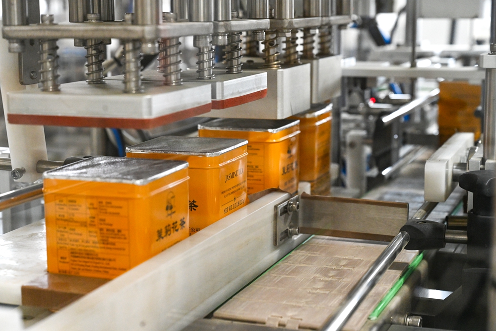 在位于福州市的福建茶叶进出口有限责任公司福兴茶叶加工厂流水线上拍摄的罐装的茉莉花茶(2023年4月11日摄)。新华社记者 周义 摄
