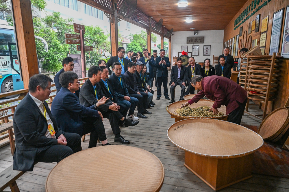 在位于福州市的春伦茉莉花文创园,来自哥斯达黎加的华人华侨参观茉莉花茶的非遗制作技艺(2023年4月12日摄)。新华社记者 周义 摄