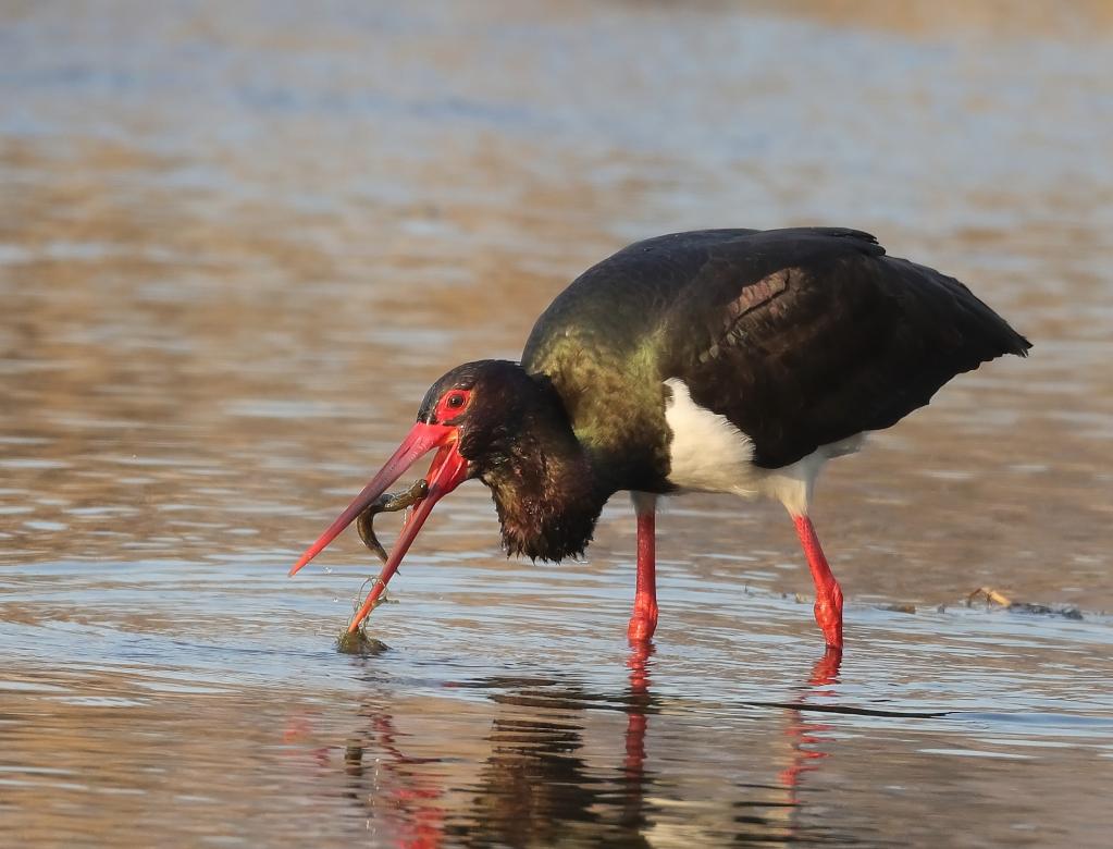 图为在北京房山区拍摄到的一只黑鹳正在觅食。(北京市园林绿化局供图)