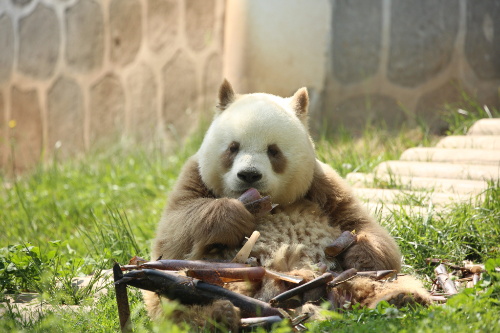 秦岭大熊猫研究中心的棕色大熊猫“七仔”正在吃竹笋。(徐光岚 摄)