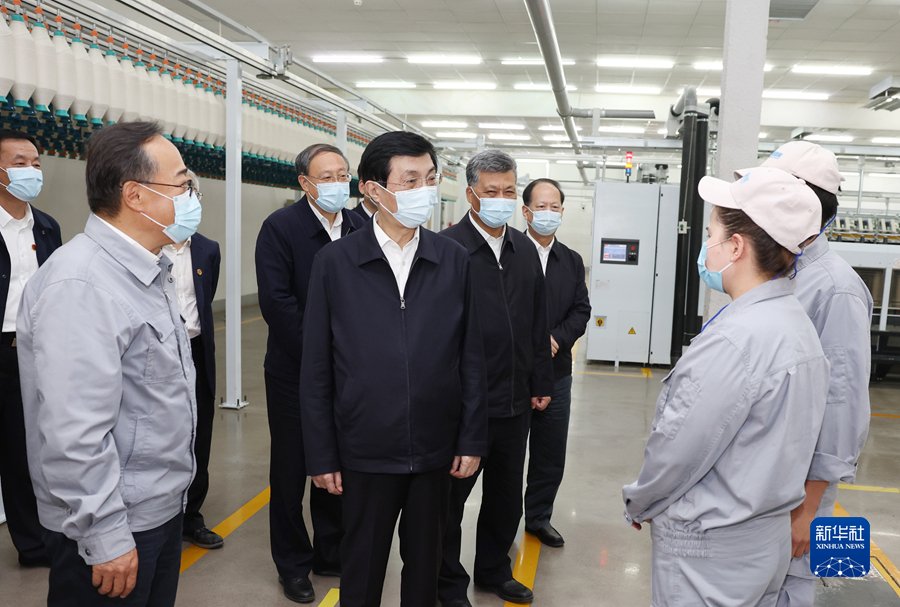 5月22日至24日,中共中央政治局常委、全国政协主席王沪宁在新疆调研。这是5月23日王沪宁在新疆东纯兴集团车间与职工交谈。新华社记者 姚大伟 摄