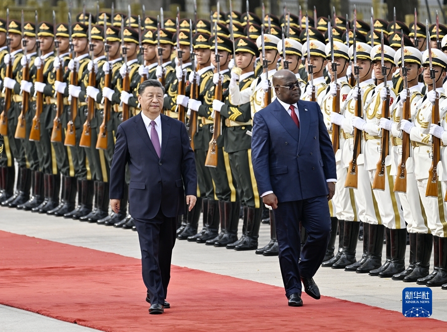 5月26日下午,国家主席习近平在北京人民大会堂同来华进行国事访问的刚果(金)总统齐塞克迪举行会谈。这是会谈前,习近平在人民大会堂东门外广场为齐塞克迪举行欢迎仪式。新华社记者 殷博古 摄