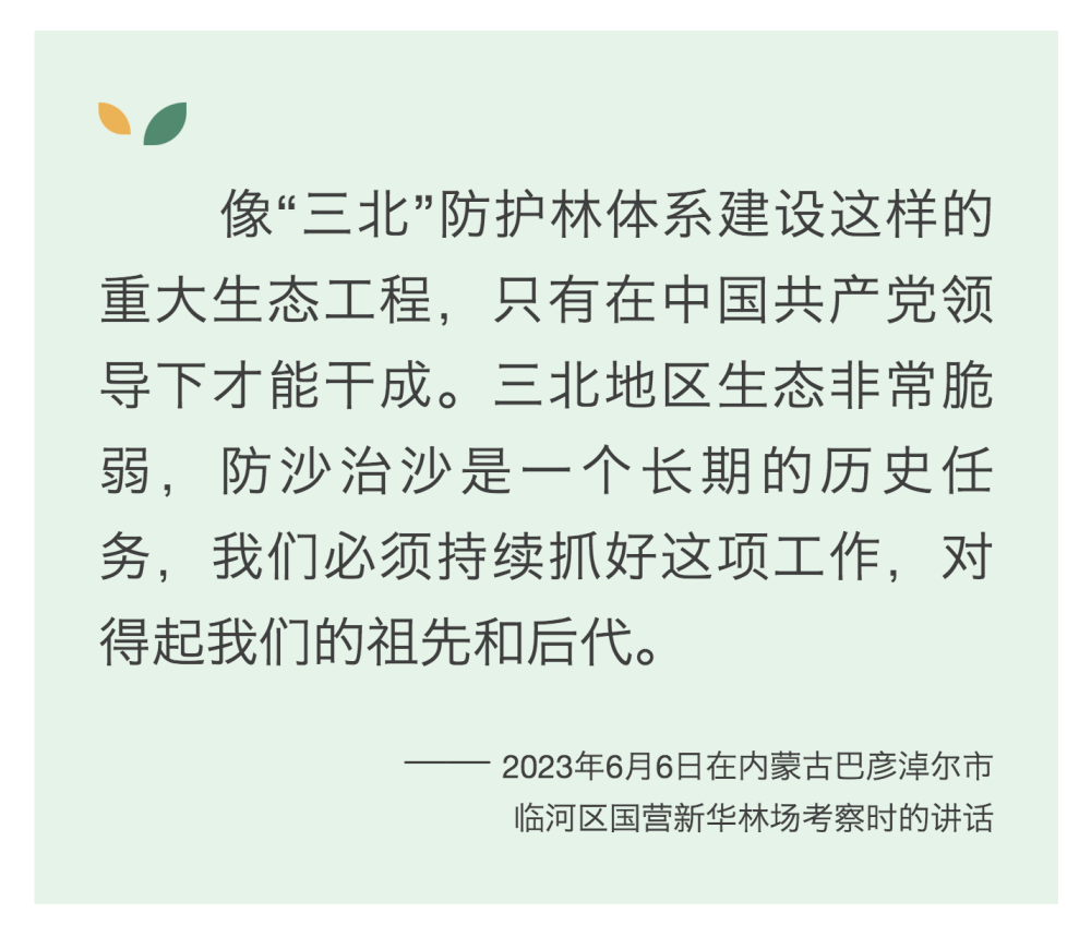 加强荒漠化综合防治,深入推进“三北”等重点生态工程建设,事关我国生态安全,事关强国建设,事关中华民族永续发展,功在当代,利在千秋。