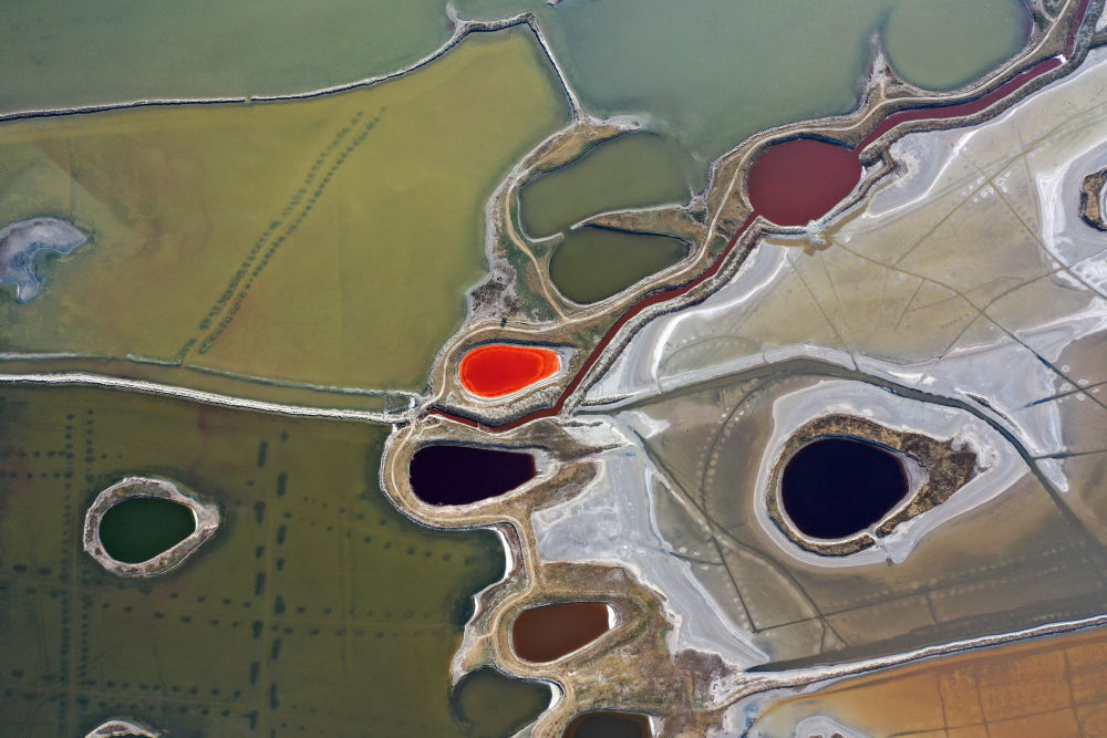 山西运城盐湖一角(2021年6月1日摄,无人机照片)。新华社记者 詹彦 摄