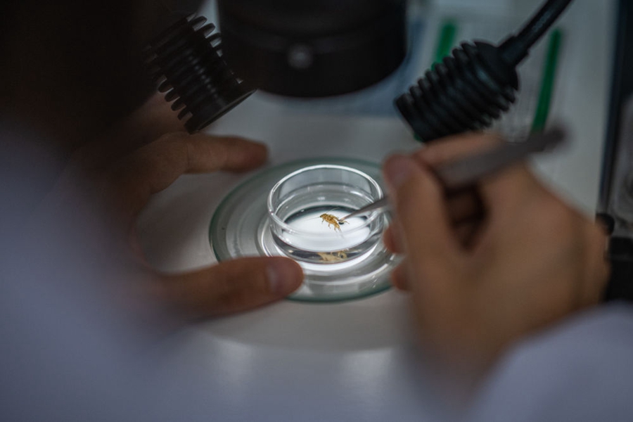 在长江流域生态环境监督管理局实验室,监测人员对底栖动物样品进行鉴定 肖艺九/摄