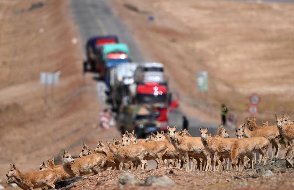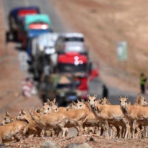 迁徙产仔季,在可可西里五道梁保护站附近,记者经常看到,成群的雌性藏羚羊,在头羊带领下,迈着小碎步,整齐而迅速地穿过青藏公路。往来车辆在工作人员指挥下排起长长的队伍,没有鸣笛、没有围观,只有让行,一切如此自然。