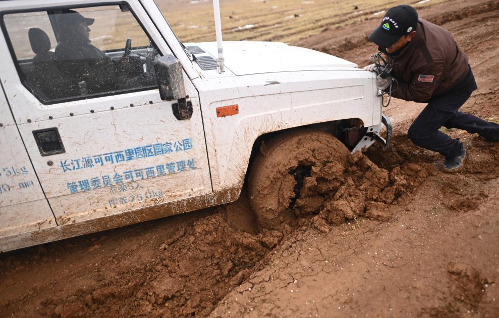 “糟糕,陷车了。”颠簸前行了一个多小时后,我们的车还是陷在了烂泥滩里。队员们熟练地戴好手套、拿起铁锨,开始忙活。