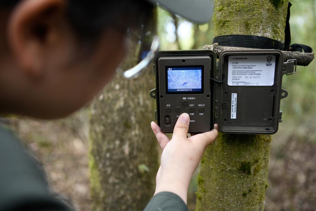 5月15日,在大熊猫国家公园荥经片区,荥经县管护总站科研检测负责人付明霞在翻看红外相机里拍摄到的小熊猫画面。新华社记者 胥冰洁 摄