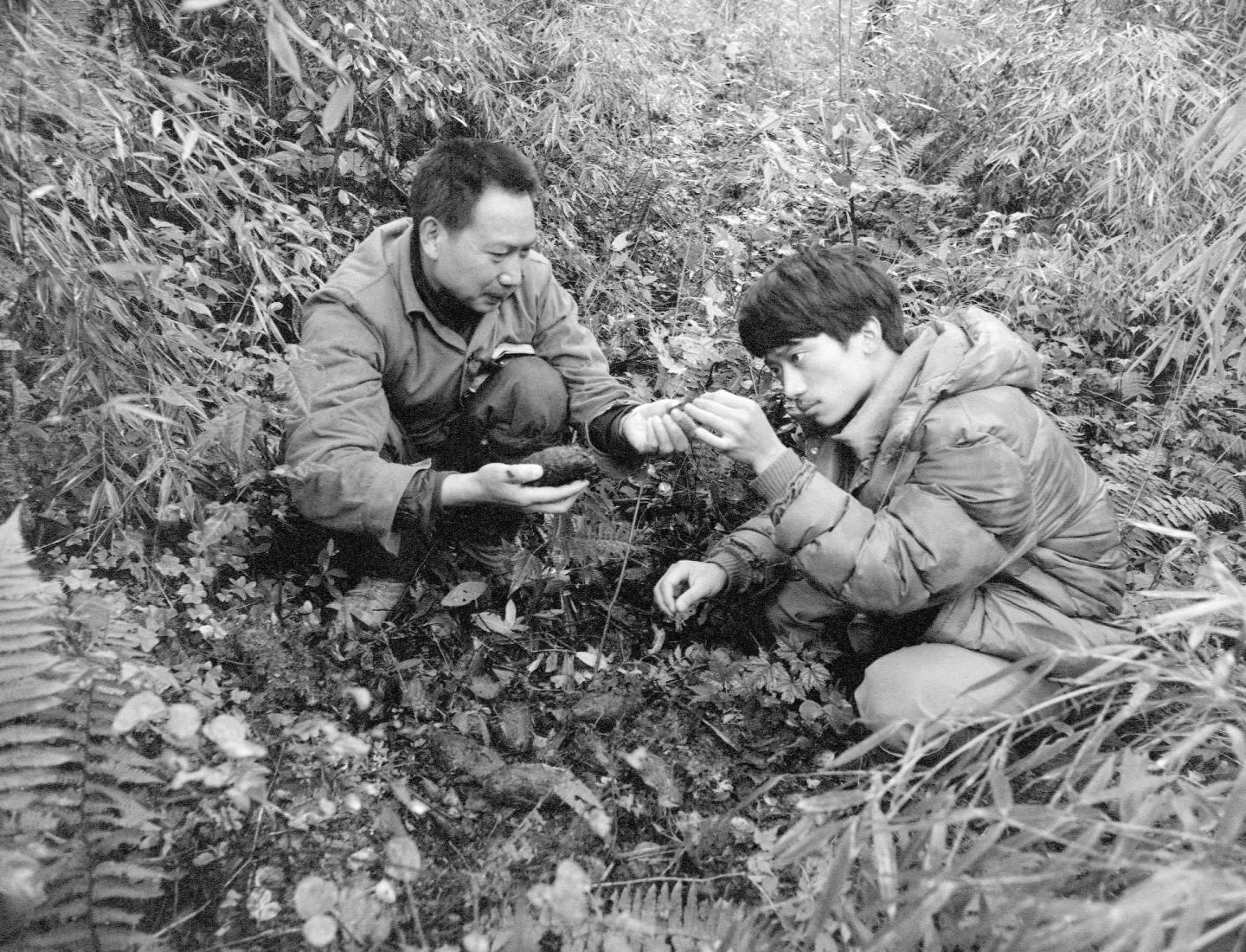 “中国大熊猫之父”胡锦矗(左)与时任“五一棚”监测站负责人王鹏彦(右)一起分析大熊猫粪团,寻找它们的活动踪迹,以准确地投放补充饲料。新华社记者 金勖琪 摄