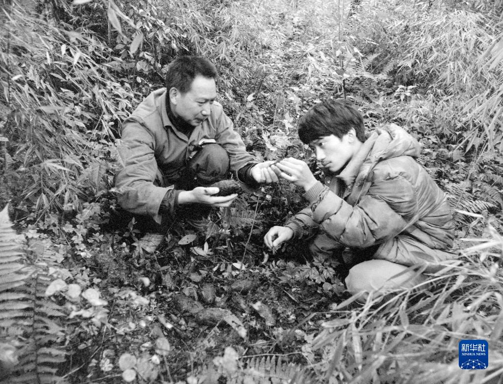 “中国大熊猫之父”胡锦矗(左)和时任“五一棚”监测站负责人王鹏彦(右)一起分析大熊猫的粪团,寻找它们的活动踪迹,以准确地投放补充饲料(资料照片)。新华社记者 金勖琪 摄