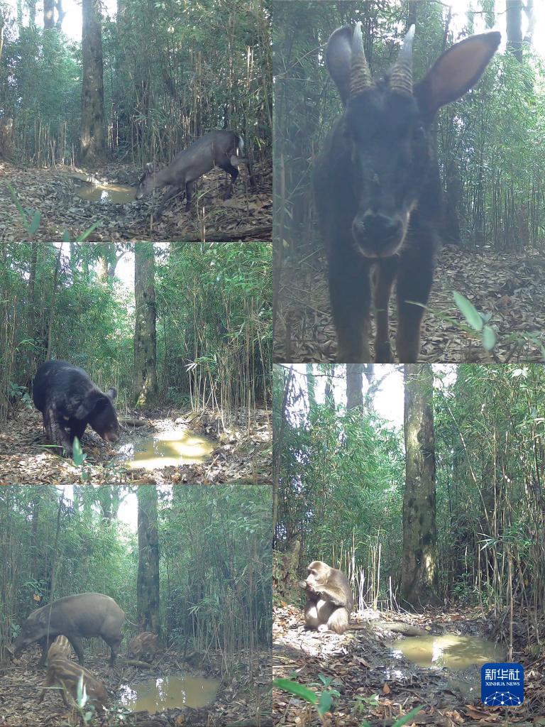 大熊猫国家公园荥经片区红外相机拍摄到的野生动物:毛冠鹿(左上)、黑熊(左中)、野猪(左下)、中华鬣羚 (右上)、藏酋猴(右下)。新华社发