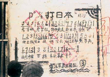 写在墙壁上的宣传抗日歌曲。这首名为《打日本》的歌词、乐谱照片摄于1940年2月3日,地点为广西壮族自治区宾阳县。书中刊印照片。