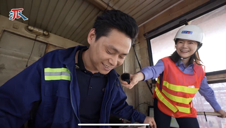 单玉紫枫在宁波舟山港轿厢内采访桥吊司机