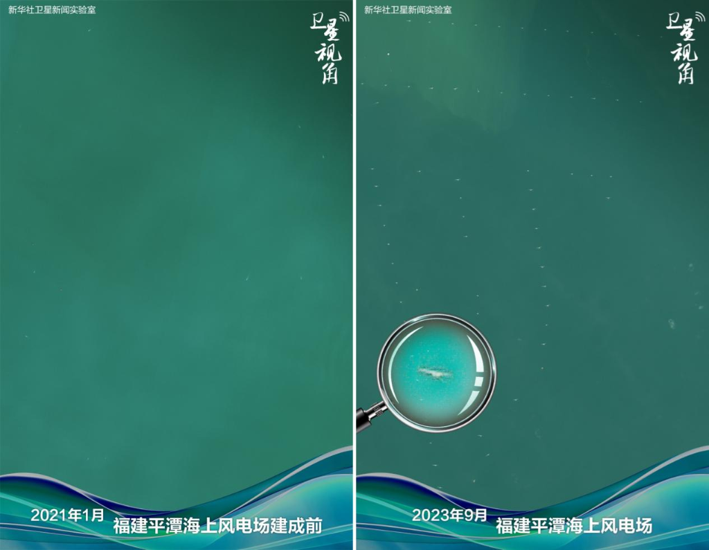 ↑2023年与2021年对比,一座座海上“擎天柱”屹立于福建平潭海上风电场。