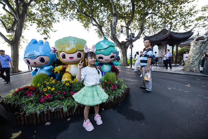 9月29日,游客与杭州西湖断桥边的亚运会吉祥物合影。新华社发(伊凡 摄)