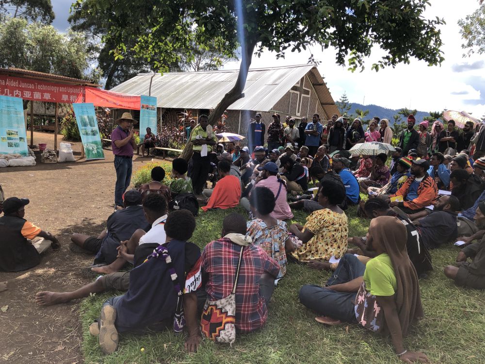 中国专家在巴布亚新几内亚东高地省中国援助巴新菌草和旱稻技术项目第9期培训班上授课(2020年12月15日摄)。新华社发