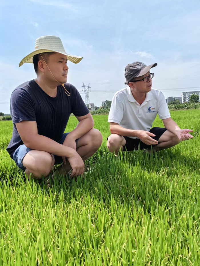 湖南省荷尖人才、湖南杂交水稻研究中心助理研究员韶也(左一)与导师在田间开展研究。(受访者供图)
