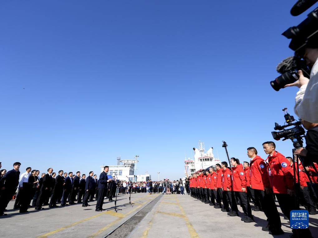 11月1日在中国极地考察国内基地码头拍摄的中国第40次南极科学考察队出征仪式。新华社记者 张建松 摄