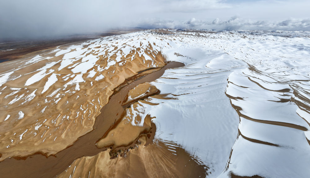 2023年10月16日在新疆阿尔金山国家级自然保护区拍摄的白雪覆盖的大沙子泉(无人机照片)。新华社记者 李响 摄