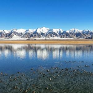 2023年10月18日,在新疆阿尔金山国家级自然保护区,针尾鸭等水鸟在依协克帕提湖栖息(无人机照片)。新华社记者 李响 摄