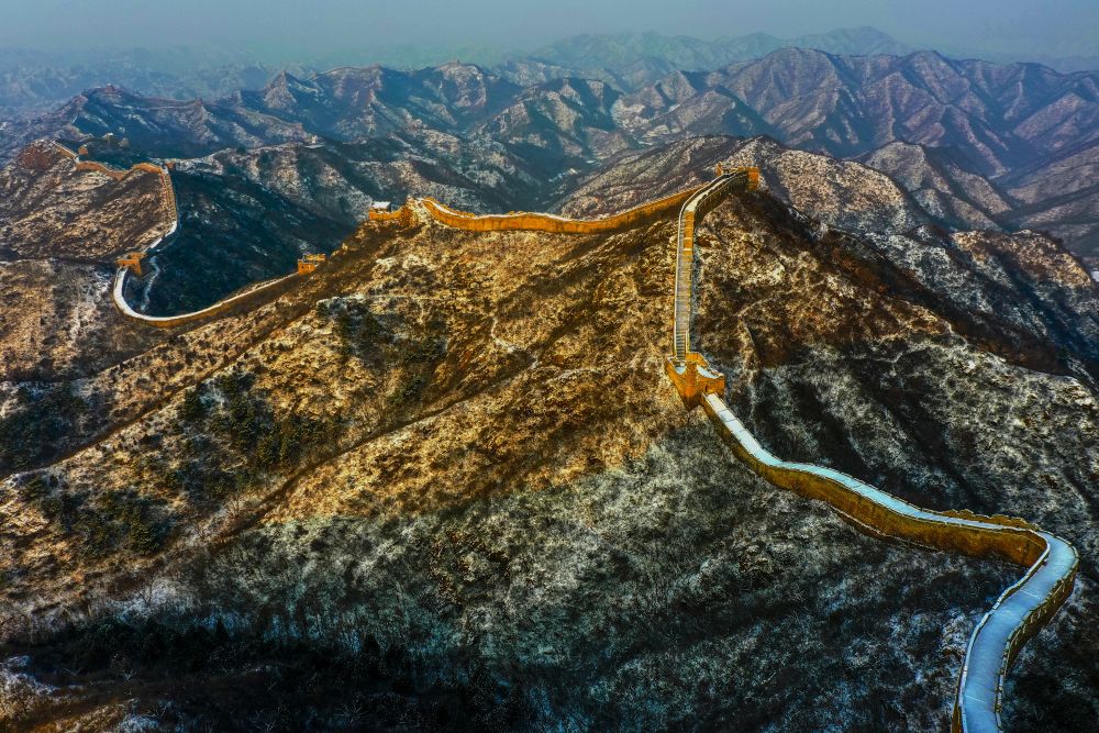 雪后的金山岭长城(1月13日摄,无人机照片)。