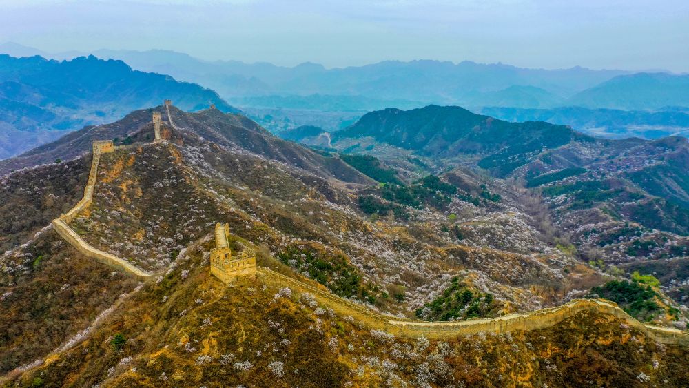 金山岭长城(4月1日摄,无人机照片)。