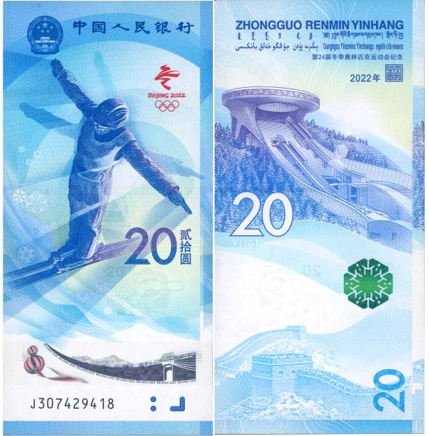 ↑2021年发行的第24届冬季奥林匹克运动会纪念钞——雪上运动项目,其将长城形象应用在动感全息、胶印、荧光等多种防伪图案中。(中国印钞造币集团有限公司供图)